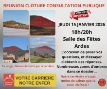 Dans le cadre de l'enquête publique sur le projet de carrière au Sarran, une réunion va se tenir jeudi 15 janvier à 18h à la salle des fêtes d'Ardes.